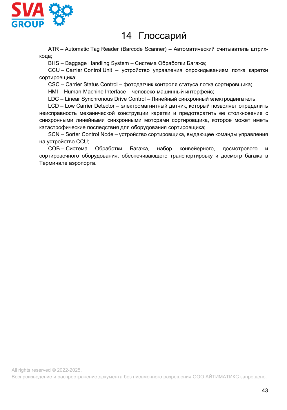 Руководство предназначено для операторов и технического персонала, обслуживающих сортировочное оборудование Vanderlande Industries Helixorter,модернизированное системой управления сортировщиками Тегрум™, разработанной ООО «АЙТИМАТИКС». В случае, если иное не указано непосредственно в тексте документа, под термином «сортировщик» понимается модель Helixorter производства Vanderlande Industries, используемая в рамках проекта №73750 в международном аэропорту Пулково, г. Санкт-Петербург.
